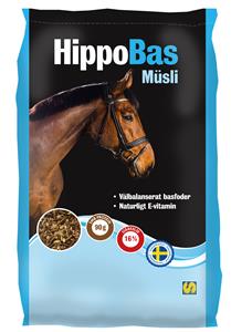 HippoBas Müsli innehåller väl utvalda fiberråvaror med fett och ångkokt spannmål som ger ett allsidigt foder. God proteinkvalitet som framförallt kommer från värmebehandlade ärtor, sojamjöl och bryggerijäst. En hög andel lucernmjöl bidrar med högvärdigt protein med en källa till den essentiella aminosyran lysin. Lucernmjöl bidrar även till god smaklighet och fiber av god kvalitet. Kombinationen av råvarorna skapar en gynnsam balans mellan energi, protein och fiber. HippoBas Müsli innehåller naturligt E-vitamin och organisk selen för bästa möjliga upptag och för ett ökat immunförsvar.